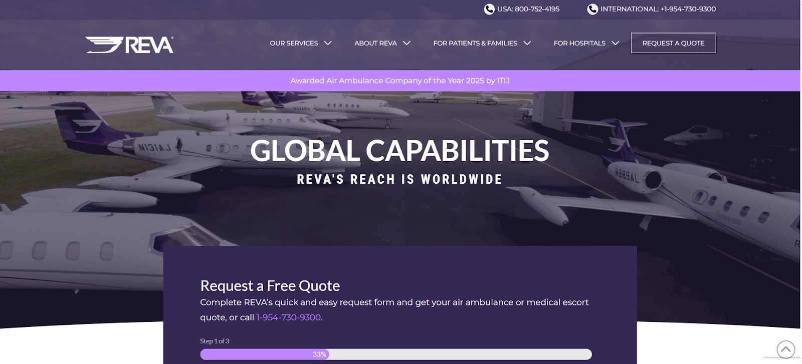 REVA offers comprehensive air ambulance and medical transport services with over 30 years of experience. Its global medevac teams coordinate bedside pickup through arrival at the destination, including in-flight care from experienced medical professionals. REVA’s services include air ambulance, repatriation, and medical escorts.